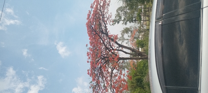 The image depicts an outdoor scene in Kisumu, Kenya, under a clear, bright blue sky with scattered white clouds. The foreground shows the upper portion of a silver vehicle, specifically the roofline and the upper sections of two passenger windows on the driver's side, which feature dark tinted glass and visible rain deflectors. Dominating the midground is a large, mature tree with a broad, dense canopy covered in vibrant red-orange flowers, characteristic of a Flamboyant tree. Its trunk is dark and appears multi-branched. To the right and behind this tree, additional green trees and foliage are visible. In the distant background, beyond the trees, faint outlines of structures or buildings can be discerned, suggesting an urban or semi-urban environment. No individuals are visible, and no actions or interactions are depicted.