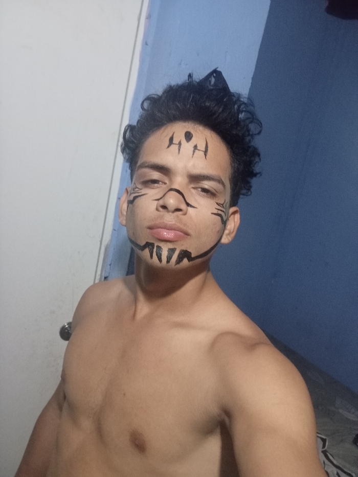 A shirtless young man with dark, curly hair poses for a selfie. He has black face paint resembling tribal markings or a mask. These markings include designs on his forehead, lines extending from his nose, and jagged patterns around his mouth. The background consists of a white wall and a partially visible blue wall. His expression is serious.