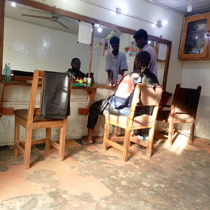 A barber shop scene features a customer with a red cape seated in a brown chair, getting a haircut