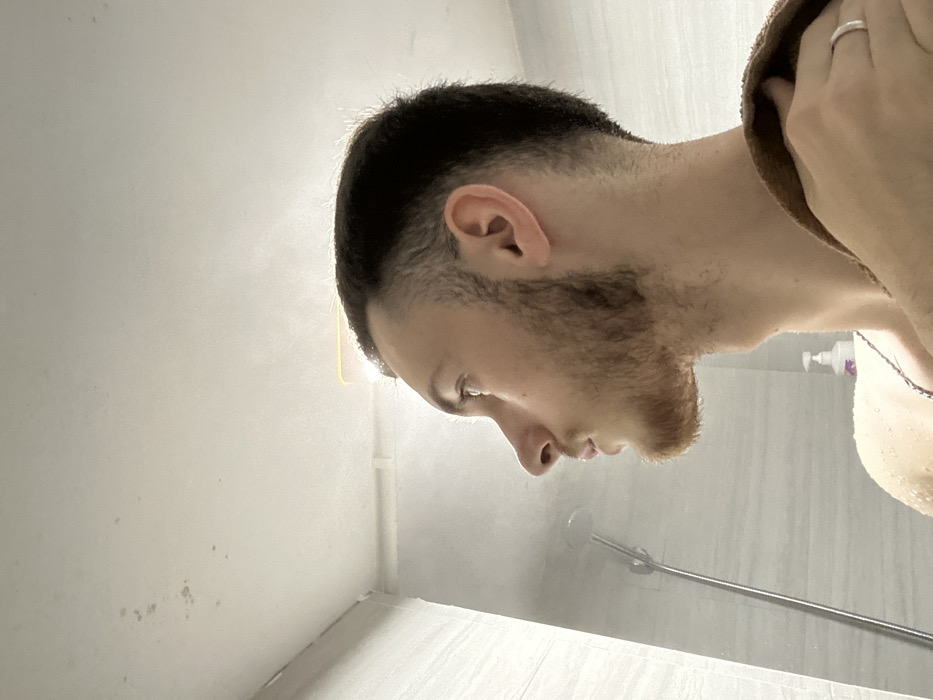 A young adult male is depicted in profile, facing left, within a bathroom setting located in Hà Nội, Vietnam. He has short, dark hair with faded sides and a light brown beard and mustache. His bare skin appears wet with visible water droplets. A silver ring is present on the ring finger of his left hand, which holds a brown towel draped over his right shoulder. His gaze is directed slightly upwards and to the left. The environment consists of light-colored, striped tiled walls and a silver handheld showerhead on the left. A white pump bottle is visible on a surface behind the subject. The white ceiling displays several dark, irregular stains, and a warm-toned light source is visible above his head.