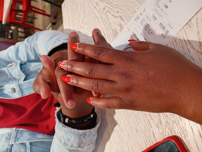 This image depicts an indoor scene within a restaurant or cafe in Nanyuki, Kenya. The focal point is a pair of dark-skinned hands resting on a light-colored, wood-grain patterned table. In the immediate foreground, a hand, likely female, is positioned palm-down, displaying short, squarish fingernails painted glossy red, with the ring finger featuring a clear base with a red and white swirled or striped design. Behind and partially obscured by this hand are the clasped hands of a second individual, likely male, wearing a light blue denim jacket over a red t-shirt, and a black digital wristwatch on the left wrist. On the table, to the left, the corner of a red-cased smartphone is visible. To the right, a white paper receipt is partially legible, displaying "TOTAL: KES90.00" and a date of "10 January 2023". The background is blurred, showing elements consistent with a dining establishment, including red chairs and dark table surfaces.