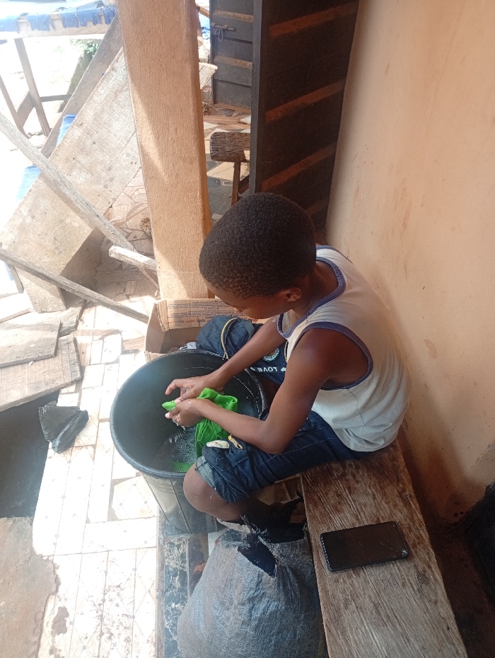In Akpaka Forest Reser, Nigeria, a young individual is seated on a wooden bench, handwashing a green fabric in a black plastic bucket filled with water. The person wears a white and blue sleeveless top and dark shorts. A black smartphone with a cracked screen lies on the wooden bench to the individual's right. The ground consists of light-colored, irregularly laid tiles. Two dark plastic bags are present on the ground near the bucket and beneath the bench. The background features a light orange-brown wall, a dark wooden structure with horizontal slats, and an area to the left containing assorted wooden planks and debris.