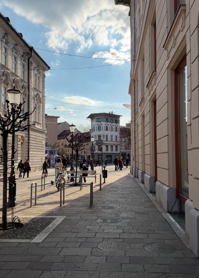 pedestrian street in a European city. The street is paved with stone blocks and lined with buildings. There are people walking on the street, including pedestrians and a bicyclist. The sky is blue with scattered clouds and the sun is shining, casting shadows on the ground. The camera is stationary.