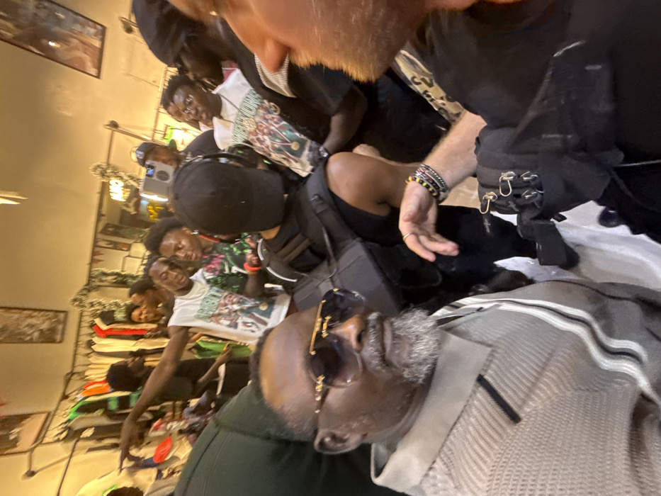 An upward-angled, indoor shot depicts a group of individuals, mostly young Black men, gathered closely. The foreground is dominated by an older Black man wearing sunglasses, with another person's hand and arm visible above him. The background reveals a clothing store interior, with racks of apparel. The perspective is skewed, creating a crowded, informal atmosphere.