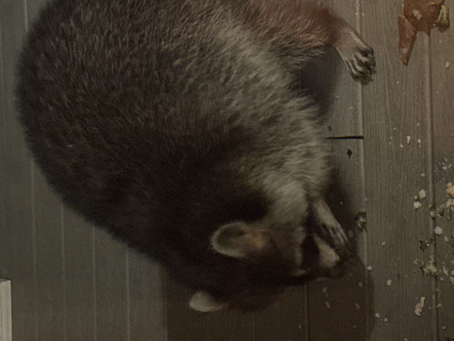A raccoon appears in an overhead shot, its head oriented towards the lower-left corner