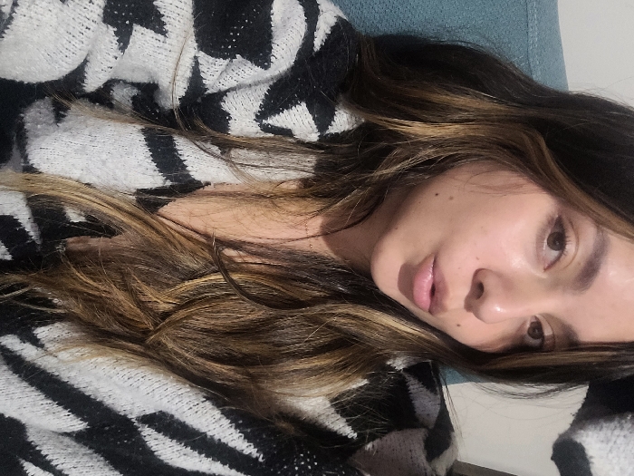 A woman with long brown and blonde highlighted hair reclines, facing the camera. Her complexion is fair, with defined facial features. She is wearing a black and white patterned sweater. The backdrop is a soft, solid teal or blue color. The lighting casts shadows across her face, emphasizing her eyes and lips. She appears relaxed and comfortable in the candid shot.