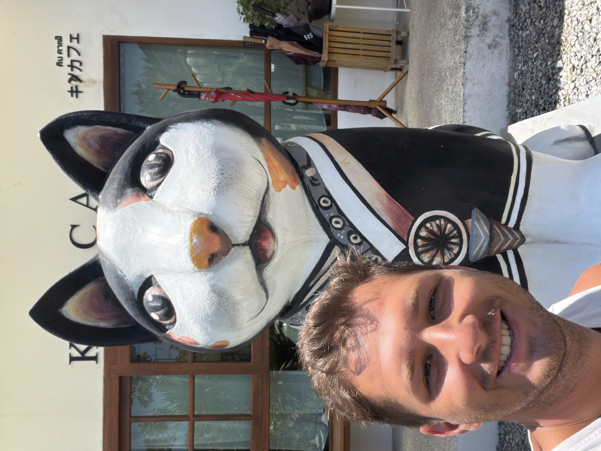 A Caucasian male, approximately 20-35 years old, with short brown hair and light stubble, is depicted in a close-up selfie, smiling directly at the camera. He wears a white tank top. Behind him stands a large, multi-colored anthropomorphic cat statue, painted predominantly black, white, and orange. The statue features large, dark eyes, an orange nose, and is adorned with a stylized uniform including white stripes, circular patterns, and a wheel-like emblem on its chest. The statue is positioned outdoors on a concrete patio in Kathu, Thailand, adjacent to a light-colored building. The building features a large wooden-framed window and a sign above it displaying "K C A" (partially visible), "คิน คาเฟ่" (Kin Cafe in Thai), and "キンカフェ" (Kin Kafe in Japanese Katakana). To the right of the statue, a wooden coat rack holds a red umbrella, and a wooden slatted container holds several other umbrellas. A small bonsai tree is visible on a white table. The ground in the foreground is covered with light-colored gravel.