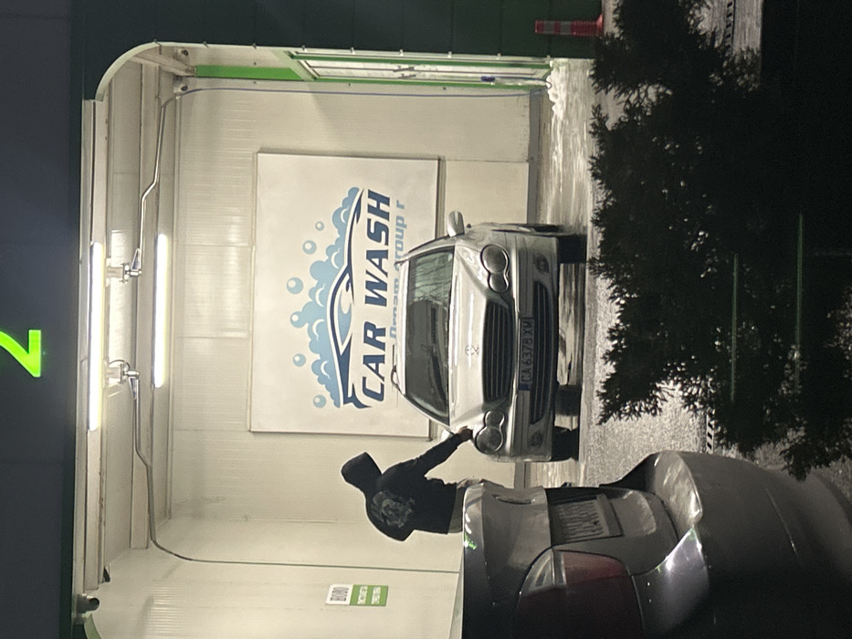 The scene depicts a nighttime operation at a self-service car wash bay in Mramor, Bulgaria