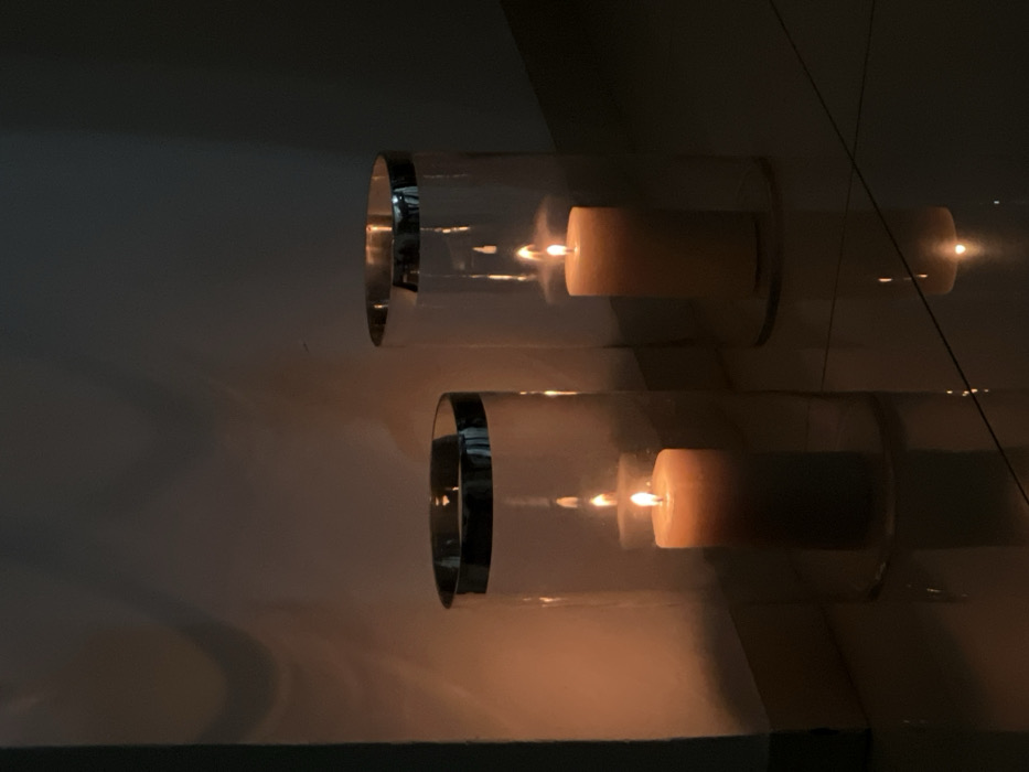 Two lit pillar candles are displayed within tall, clear glass hurricane lamps, each featuring a silver-colored top rim. They are positioned on a highly reflective, dark-tiled floor, which accurately mirrors the candles and their flames. The candle on the left is a darker beige, while the candle on the right is a lighter beige. The ambient environment is dimly lit, with the candles serving as the primary light source, casting warm, orange-yellow light onto a pale wall visible behind the left candle and creating soft shadows. No individuals are present in the scene. The location is Ashkelon, Israel.