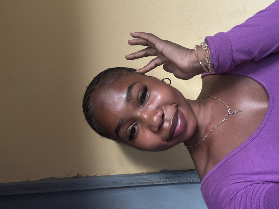 A woman with dark skin and braided hair is angled to the left. She is wearing a purple, long-sleeved top and a silver necklace with a cross pendant. She has a nose piercing and several beaded bracelets on her left wrist. She is smiling slightly and has her left hand near her face, gesturing with three fingers extended. The background is a plain yellow wall. The lower portion of the wall has a dark border.