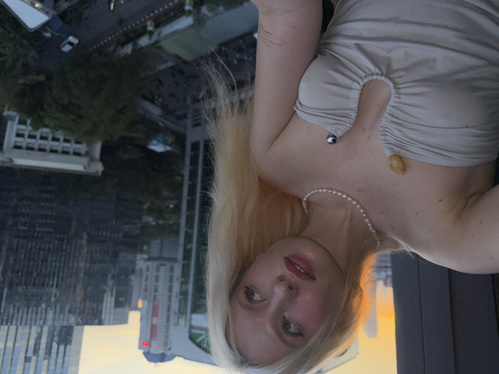 - "A fair-skinned female subject with long blonde hair is depicted in a selfie, taken from a high vantage point overlooking an urban landscape at dusk or sunset" by FM-OLV0s2, licensed under CC BY 4.0