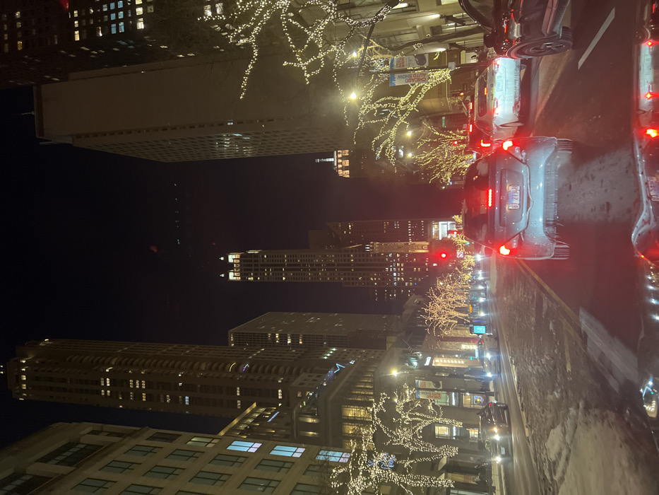 Night city view from a street with traffic. Buildings line the left side, illuminated with lights. Trees decorated with white string lights are along the street. Cars are stopped at a traffic light, with their rear lights visible. Tall buildings stretch into the night sky.