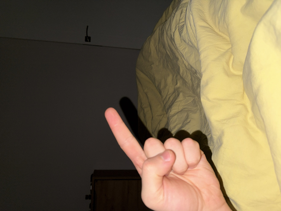 A hand gestures with a raised index finger, casting a sharp shadow against a dimly lit gray wall. A wrinkled yellow fabric occupies the right side of the frame, seemingly a bed cover or blanket. A dark wooden dresser is partially visible beneath the hand, adding depth to the composition. A small black object is attached to the wall behind the hand.