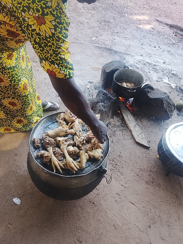An outdoor scene in Lafia, Nigeria, depicts food preparation. A person, whose lower torso and right arm are visible, is positioned in the foreground. They wear a long-sleeved garment with a green background patterned with yellow and orange sunflowers. A white sandal is visible on their left foot. Their right hand reaches into a large, metallic, shallow platter containing numerous pieces of cooked chicken, including several chicken feet and bone-in cuts. This platter rests on a larger, dark, cylindrical pot or container. To the right, a rudimentary cooking fire burns between two large dark rocks. A black metal pot with handles is seated on these rocks directly over the flames, containing liquid and additional chicken pieces. A wooden plank extends into the fire from the foreground. Further right, a portion of another large dark pot with a metallic lid is visible, resting on a dark, circular base, possibly a tire. The ground consists of dry, light brown earth, exhibiting visible footprints and small fragments of debris. Natural light illuminates the scene.