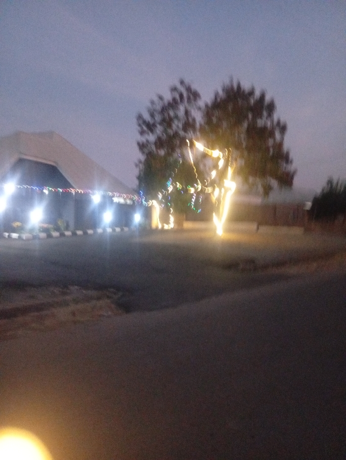 The photo captures a dimly lit night scene featuring a building with a distinctive, pointed roof, adorned with colorful lights along its edge. Trees stand nearby, illuminated with bright, yellowish lights that wrap around their trunks. The ground is dark, with a road surface visible in the foreground. The overall atmosphere is soft and somewhat blurred, indicating a possible long exposure or movement during the photo's capture.