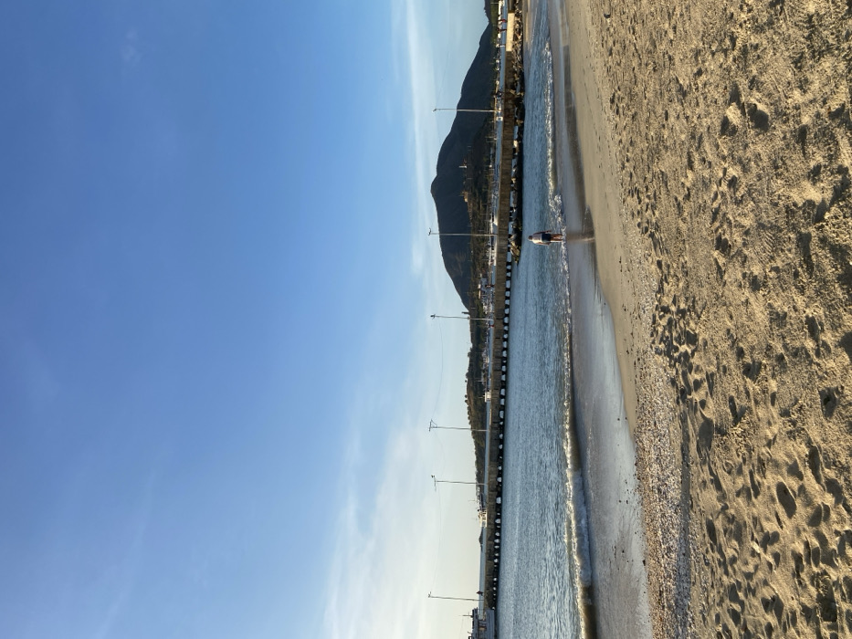 The image depicts a coastal scene in Juan Griego, Venezuela, under a clear, light blue sky with minimal high-altitude clouds. The foreground consists of light-brown sand with numerous footprints, transitioning to a strip of light-colored shells and small stones at the water's edge. Gentle waves are breaking on the shore. One individual, observed from behind, stands partially submerged in the water, facing away from the viewer. They are wearing light-colored shorts and a darker shirt. Their position places them slightly to the right of the frame's center. In the mid-ground, a concrete pier or breakwater extends horizontally across the frame, curving slightly towards the right. The pier features several evenly spaced, dark-colored light poles with fixtures. Numerous boats, predominantly small to medium-sized vessels, are moored alongside the pier. Rocky barriers are visible at the base of the pier on the right side. The background is dominated by a large, dark green, tree-covered mountain. Smaller, vegetated hills are visible to the left of the main mountain. Distant structures are faintly discernible on the far shore or hills. The lighting suggests late afternoon, with the sun low in the sky, casting subtle reflections on the water and soft shadows on the sand.