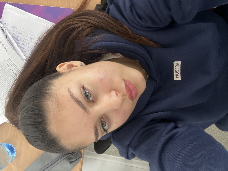 A close-up, high-angle selfie depicts a young female individual in an indoor setting. The subject, positioned centrally, has fair skin, prominent green eyes, full lips with a light pink tint, and dark brown hair styled in a high ponytail. Her hair extends over her right shoulder and behind her head. She wears a navy blue hooded sweatshirt featuring a small, rectangular white label on the chest, which reads "MUSERA." A small, silver stud earring is visible in her left earlobe. Her facial complexion shows minor blemishes, and her eyelashes appear long. The subject is looking directly into the camera. The background reveals a light-colored wooden surface, likely a desk or table. In the upper left quadrant, a partially visible clear plastic water bottle with a blue cap rests on the surface, alongside a grey pouch or bag. The upper right quadrant shows several papers and notebooks. One appears to be a lined page with handwritten text in blue ink. Another document displays printed English text, with visible phrases such as "in focus" and "TWEET LYRICS." A purple-colored cover or spine of another book or notebook is also visible. The immediate environment suggests a study or academic setting.