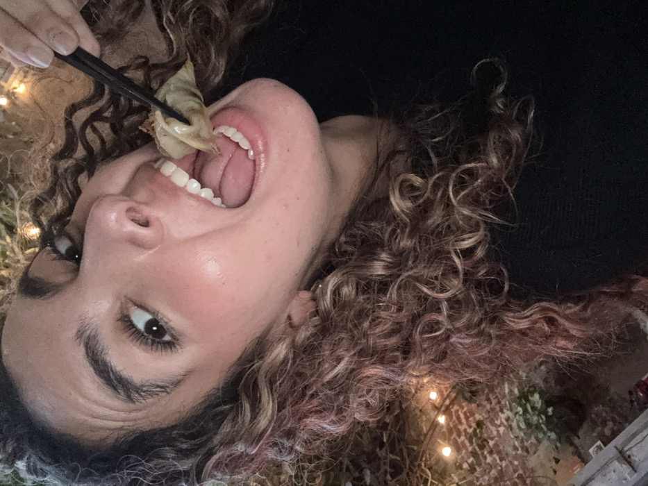A close-up image depicts a young adult female from the shoulders up, engaging in the act of eating. She possesses curly, multi-toned brown hair with lighter highlights, fair skin, and prominent eyelashes. Her mouth is wide open, revealing her tongue and upper teeth, as she uses black chopsticks to guide a light-colored dumpling towards her oral cavity. Her visible right eye is wide open and directed towards the camera. She wears a dark, possibly black, garment. The background is out of focus and dimly lit, featuring warm string lights, a section of a reddish-brown brick wall, and indistinct green foliage. The scene suggests an evening, likely outdoor or semi-outdoor dining environment in Mexico City, Mexico.