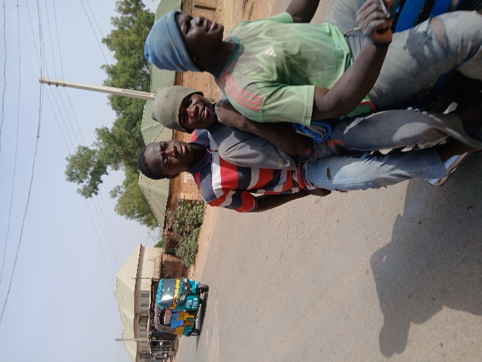 An outdoor daytime scene in Heany, Zimbabwe, depicts three young adult males riding a blue motorcycle on an asphalt road