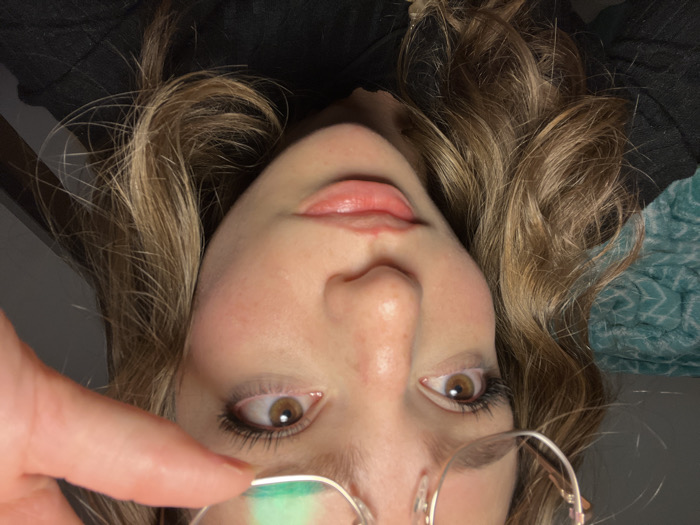 A person's face fills the frame, angled downward. Hazel eyes gaze up, framed by long lashes and arched brows. Full lips are slightly parted. Blonde-highlighted hair flows around the head, contrasting with a dark top. A hand partially obscures the view, holding glasses with a thin, metal frame. A textured teal blanket is seen beside the head. The background is a combination of gray wall and fabric.