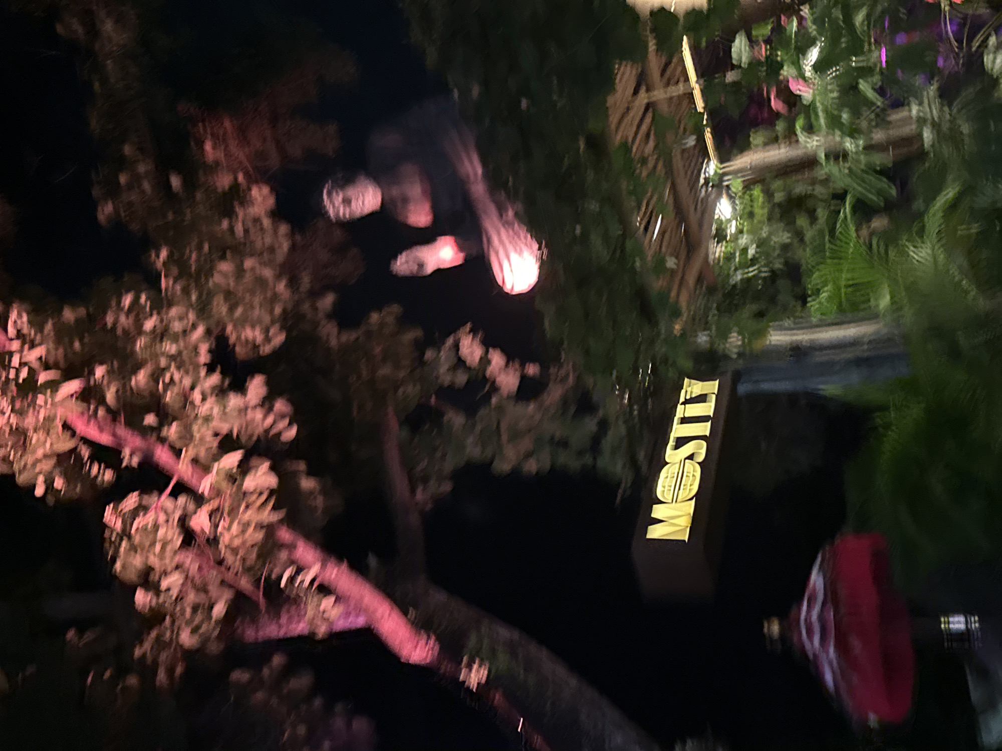 n outdoor night scene in Pererenan, Indonesia, near the restaurant "Mostly." The view is obscured by trees and foliage. Illuminated hanging lamps are visible above. A sign for the restaurant is present and lit. Additionally, a red, round object is partially visible near the sign. The scene appears dark and lush with vegetation.
