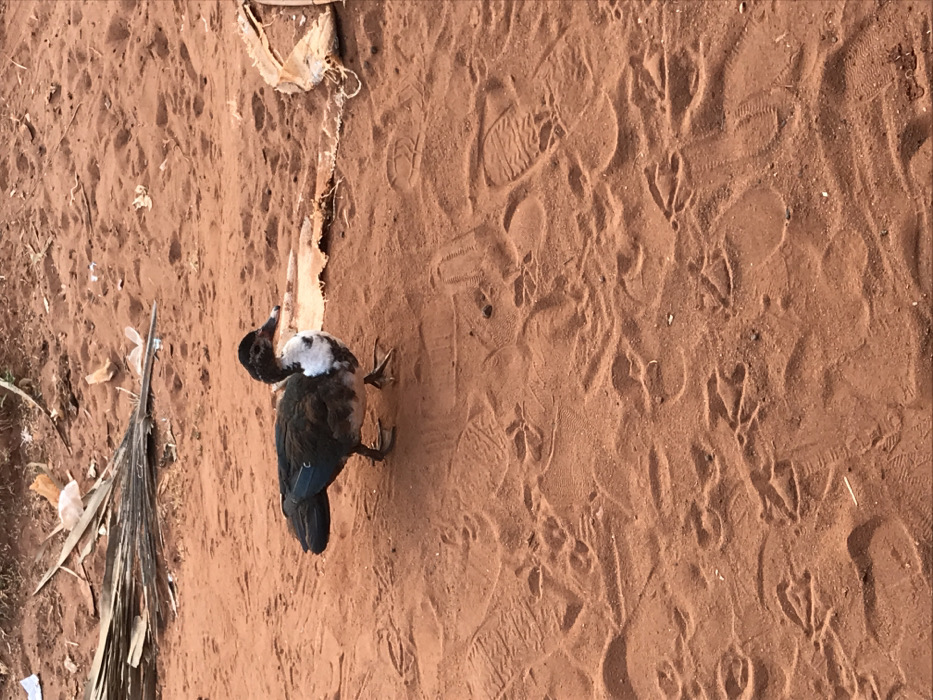 The image displays a Muscovy duck (Cairina moschata) standing on red-brown sandy ground in Ogodo, Nigeria