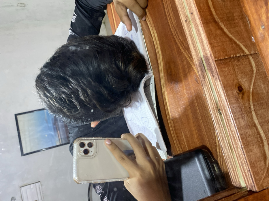 An indoor scene depicts an individual with dark hair resting their head face down on an open notebook on a wooden desk. The notebook's pages contain blue pen markings. To the left, a left hand holds a light-colored smartphone with a clear case, positioned as if taking a photograph or video. A black portable power bank is partially visible on the desk below the smartphone. In the background, a dark-framed picture featuring a landscape or seascape hangs on a plain, light-colored wall. The exact location within the city of Juan Griego, Venezuela, is not discernible from the image's content.