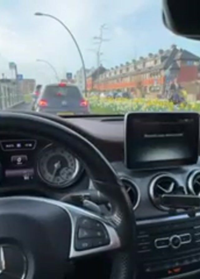 interior of a Mercedes car from the driver's perspective. The car is stopped on a street with buildings visible outside the windshield. The dashboard is visible, including the steering wheel, instrument panel, and infotainment screen which displays "Bluetooth audio device paused." There is a cell phone mounted near the center console. Traffic is visible outside the car. It is daytime.
