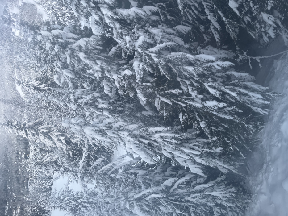 Snow-laden evergreen trees fill the frame