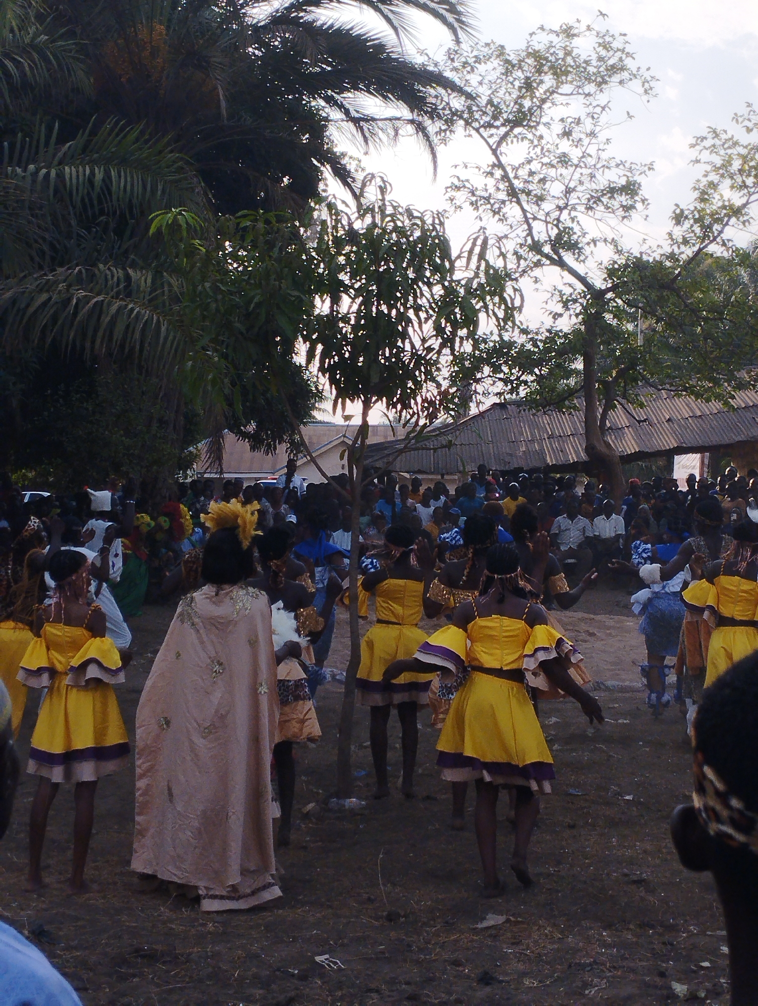 The image depicts an outdoor gathering in Akwanga, Nigeria, centered on a performance. In the foreground, several young females, likely pre-adolescent, are in motion, dressed in matching short yellow dresses with purple or pink ruffled accents on sleeves and hemlines, suggesting a synchronized dance or performance. One adult female, viewed from behind, is centrally positioned, wearing a full-length, light beige, cape-like garment with golden embroidered details and a large, prominent yellow feathered headdress. The ground is uneven, compacted dark earth with scattered organic debris and small pieces of trash. In the midground, additional performers are visible, including one individual in a green outfit with a red and yellow headdress. The background features a crowd of approximately 50-70 spectators, predominantly adults, observing the activity from standing and seated positions. Behind the crowd, several simple structures with corrugated metal roofs are visible. The scene is framed by dense tropical vegetation, including large palm fronds on the left and various deciduous trees, under an overcast or hazy sky.
