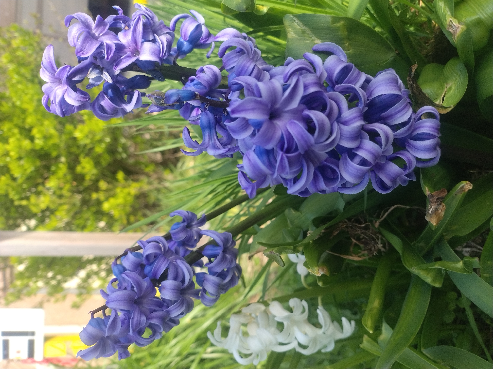 A close-up photograph captures multiple blooming hyacinth plants within a garden setting in Leudelange, Luxembourg. The foreground is dominated by three stalks of purple hyacinths, each densely packed with numerous individual florets. To the left, a cluster of white hyacinths is visible in the mid-ground, slightly out of focus. The flowers are surrounded by their characteristic broad, green, strap-like leaves and other thinner green foliage. The background, largely out of focus, reveals green shrubbery or trees, a light-colored vertical pole positioned towards the upper right, and a partial white sign with black geometric markings situated over a yellow surface in the upper left quadrant. The scene is illuminated by natural daylight. No individuals are present, and no actions or interactions are depicted.