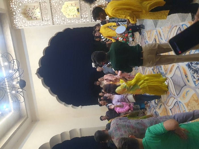 The scene depicts a nighttime social gathering within an ornate indoor or semi-open venue located in Malasar, India