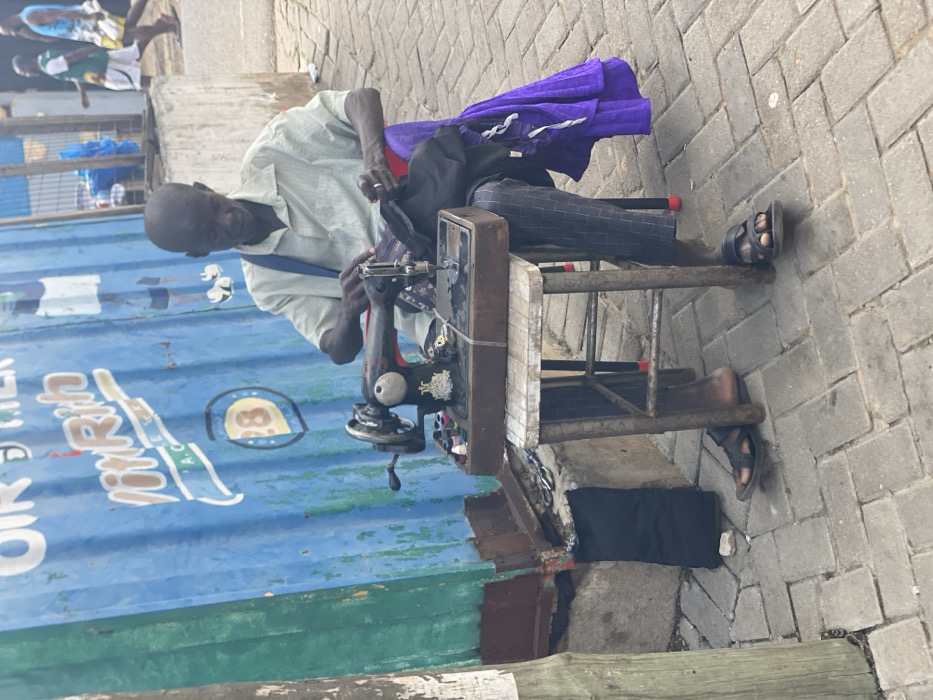 - "The image displays an elderly African male operating a vintage manual sewing machine on a paved sidewalk in Accra, Ghana" by FM-b79C12, licensed under CC BY 4.0
