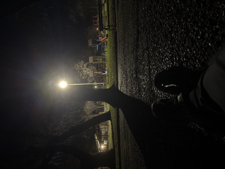 The image portrays an outdoor park or recreational area at night in Sliven, Bulgaria. The perspective is low, capturing the feet and lower legs of an individual wearing dark shoes and trousers in the immediate foreground, positioned over a dark, textured ground surface consistent with gravel or crushed stone. A single, tall streetlamp emits a bright yellow-white light from the midground-center, creating a strong halo effect and illuminating a patch of grass. Several large, bare-branched trees stand between the viewer and the streetlamp, casting prominent, dark shadows extending to the left across the ground. In the background, illuminated by ambient light, a children's playground is visible, featuring multiple wooden-framed play structures with slides (including red and blue examples), platforms, and ladders. A dark park bench is partially discernible to the far right of the playground. The sky is dark and featureless, indicating nighttime conditions.