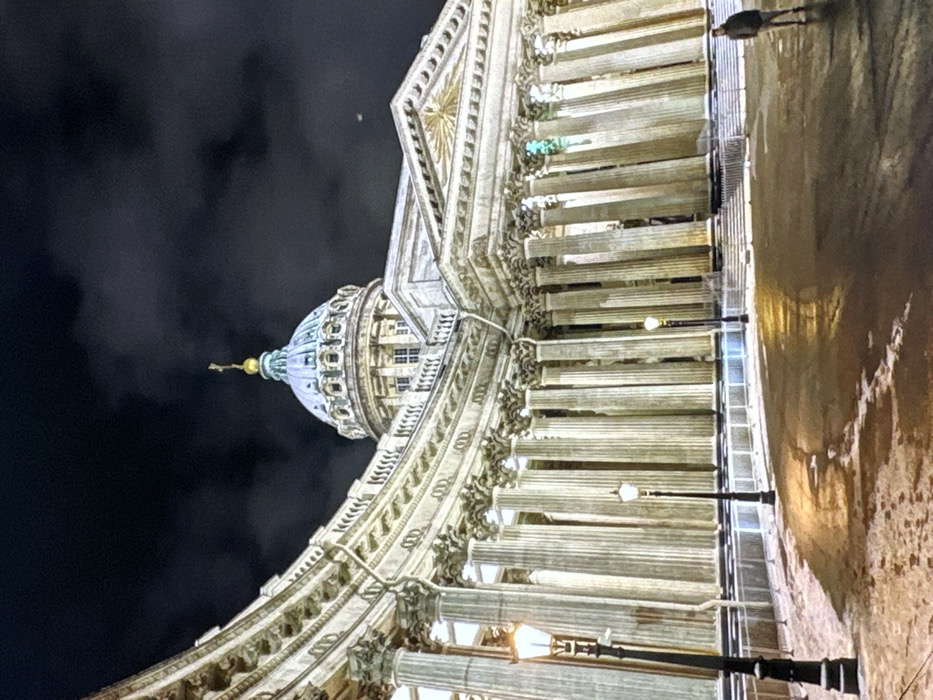 Kazan Cathedral in St. Petersburg, Russia, at night. The cathedral's iconic dome and colonnades are illuminated, contrasting with the dark sky. Streetlights add to the nighttime ambiance. The architectural details of the building are visible, showcasing its neoclassical design. A person is seen on the edge of the image. The photo captures the grandeur and beauty of the cathedral at night.