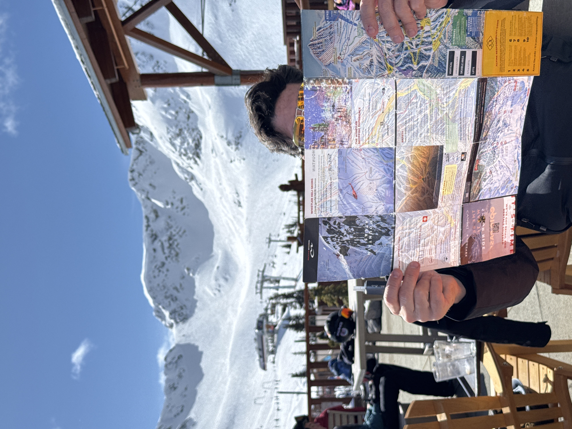 A person is holding a map of Whistler Blackcomb ski resort, Whistler, Canada, in front of their face. The map features details about ski runs, lifts, and amenities. In the background, there are snowy mountains, ski lifts, and other skiers. The person is sitting at a wooden table on a patio.