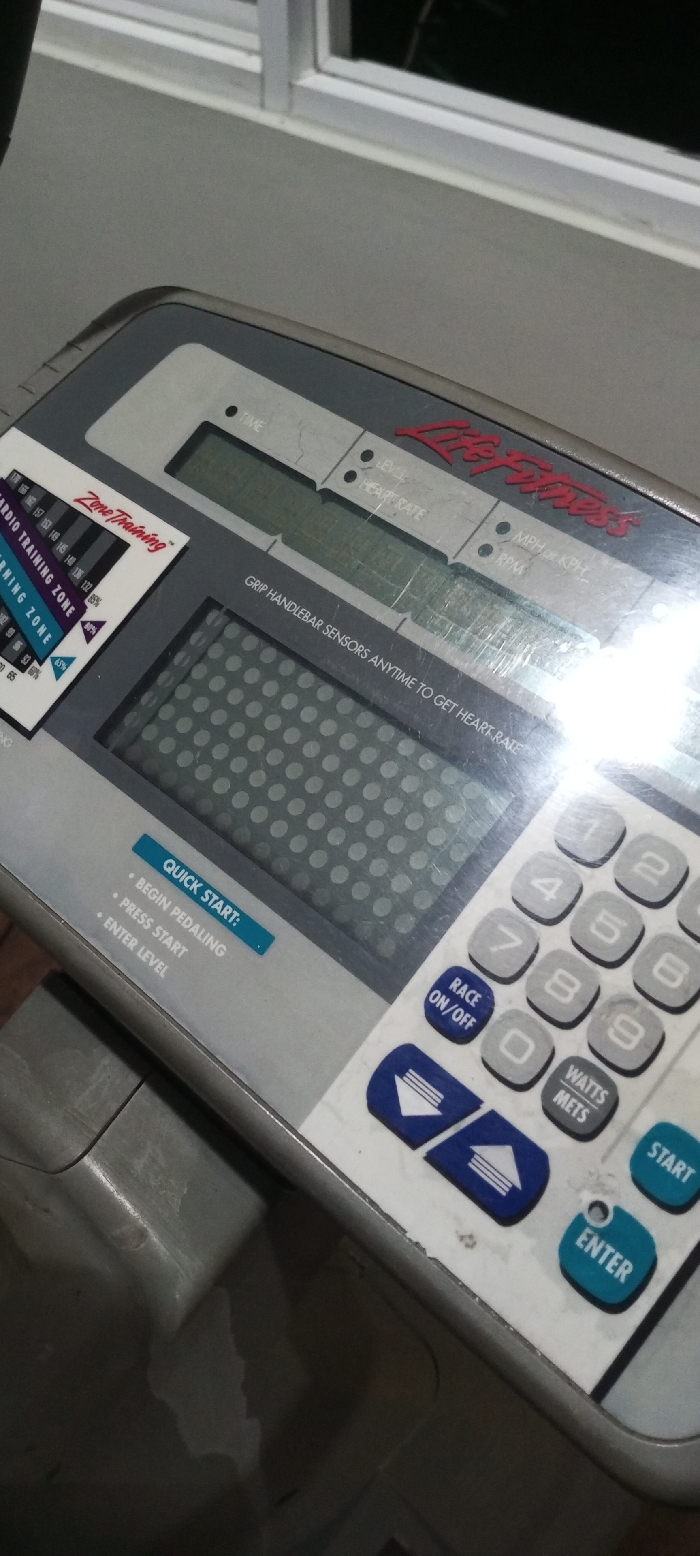 - "The image displays a close-up, angled view of the gray and white control panel of a Life Fitness exercise machine, situated indoors in Pacet, Indonesia" by FM-4c8dY2, licensed under CC BY 4.0