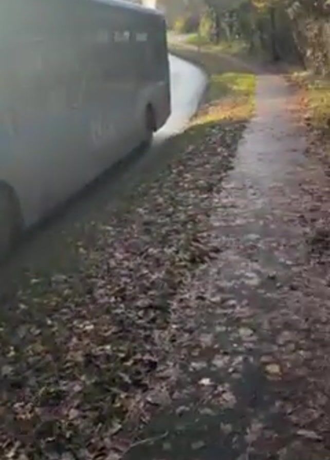 The video begins with a blue bus labeled "Ruthe Circular H" driving on a narrow road next to a wooded area