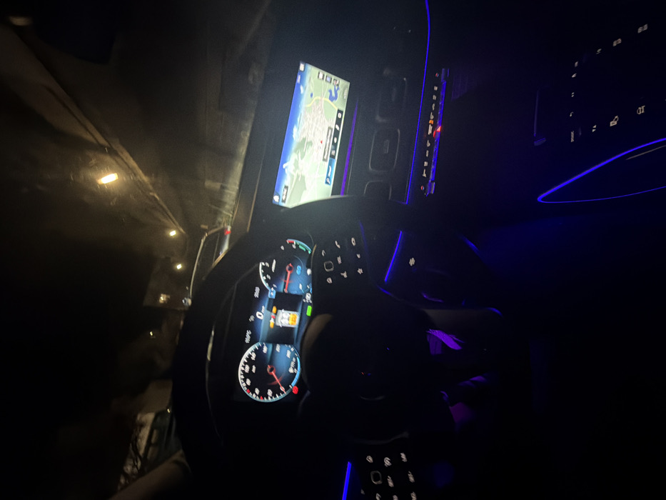 The image displays the interior cockpit of a vehicle at night, viewed from a low perspective, likely from the driver's position