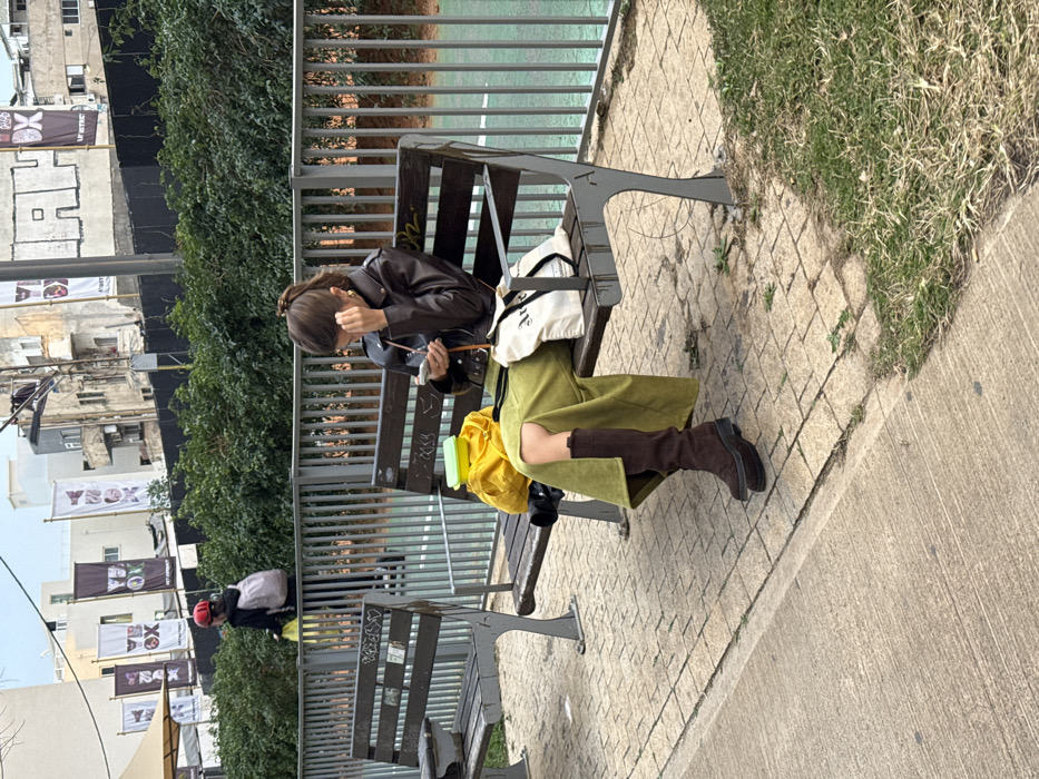 The image displays an urban park scene in Tel Aviv-Yafo, Israel. A female subject, with brown hair tied in a ponytail, is seated on a slatted wooden park bench with light grey metal supports. She is wearing a dark brown leather jacket, a long olive green skirt, and dark brown knee-high boots with chunky soles. Her right hand partially covers her face, while her left hand holds a white smartphone which she is viewing. A bright yellow bag, a light green lidded container, and a cream-colored canvas tote bag are positioned on the bench next to her. Behind the benches, a grey metal fence with vertical bars separates the immediate area from a dense green hedge. Beyond the hedge, a light blue-green paved path is visible. In the background, several multi-story urban buildings are present under an overcast sky, with overhead wires visible. Displayed against these buildings are multiple large banner flags, predominantly white and black, featuring abstract designs and English text, including "YARD" and "BOX." In the upper left background, a second individual is partially visible, wearing a red helmet and a light-colored backpack, moving leftward on what appears to be a personal transport device, carrying a yellow bag in their left hand. The foreground consists of a concrete path, transitioning to a paved area with light-colored square pavers beneath the benches, and a patch of dry grass to the right.