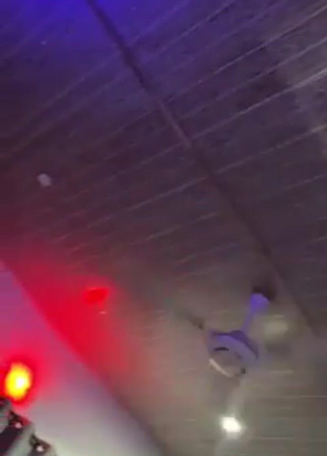 A video shows a ceiling with a wood-like paneling and a white ceiling fan with rotating blades
