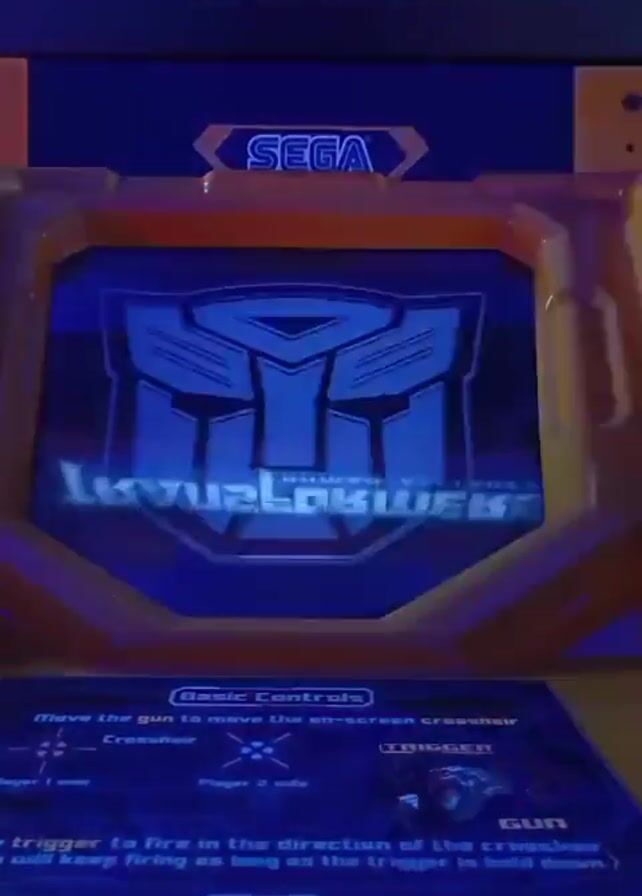 The camera shows a close-up view of a "Transformers" arcade game