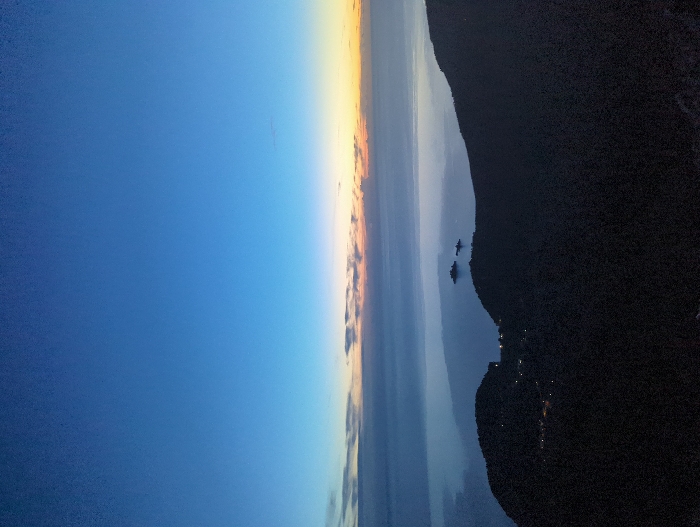 A serene dusk over water displays a gradient sky from blue to orange. A dark, silhouetted land mass dominates the right side, hinting at mountainous terrain. A scattering of faint lights suggests a settlement along the coast. Small islands are visible in the water near the shore, partially obscured by shadows. The horizon blends soft colors of twilight, mirroring onto the calm water surface.