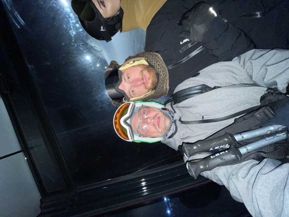 An image taken at night depicts three individuals inside a ski lift cabin, likely a gondola, at the Jahorina ski resort in Bosnia and Herzegovina