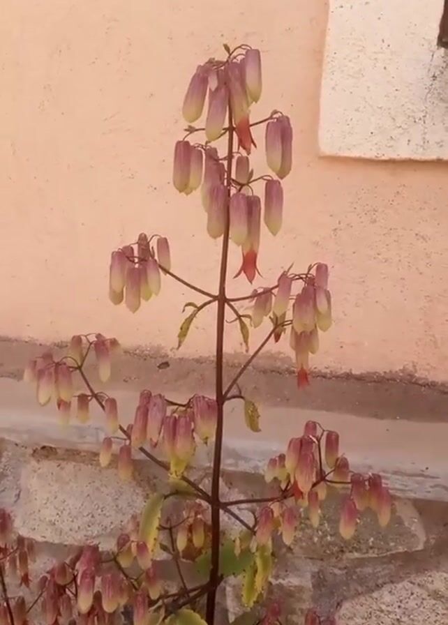 plant with drooping, bell-shaped flowers that are primarily light green and purplish-pink. The plant has multiple stems and is situated against a background of a peach-colored wall with a rectangular patch, and a base of stone blocks. The camera is static and focuses primarily on the plant.