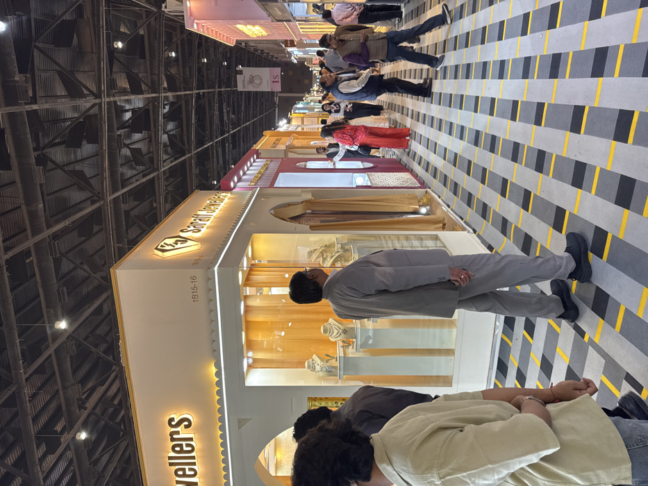 The image depicts an indoor scene within an exhibition hall, located in the city of Jaipur Municipal Corporation, India. The scene presents a bustling aisle lined with exhibition stalls, characteristic of a trade show. In the immediate foreground, to the left, a person wearing a light-colored, short-sleeved top and blue jeans stands with their back mostly to the viewer, hands clasped. Central to the mid-foreground is a man in a light grey suit and black athletic shoes, standing with his back to the camera, intently observing the display of the adjacent stall. The prominent stall on the left is labeled "Saraf Jewellers" with illuminated gold lettering and a diamond-shaped logo. The booth is predominantly white with gold trim and features several large glass display windows showcasing various silver and gold necklaces and other jewelry pieces on busts and pedestals. The number "1815-16" is visible on the booth's fascia. The stall's design incorporates scalloped architectural elements reminiscent of traditional Indian arches. Beyond the "Saraf Jewellers" booth, a long aisle extends into the background, flanked by numerous other brightly lit stalls, some with distinct color schemes like red, pink, and yellow. A sign further down the aisle displays "1S" and a ring graphic, indicating another jewelry-related vendor. Numerous individuals, both men and women, are visible walking along the aisle, browsing the displays. One woman in the mid-background is notable for wearing a bright red top and pants. The floor is covered with a patterned surface featuring an alternating checkerboard-like design of light grey, dark grey, and black rectangles, intersected by thin yellow horizontal lines. The ceiling is high, industrial-style, with exposed dark metal trusses, ductwork, and numerous overhead spotlights providing bright illumination throughout the hall.