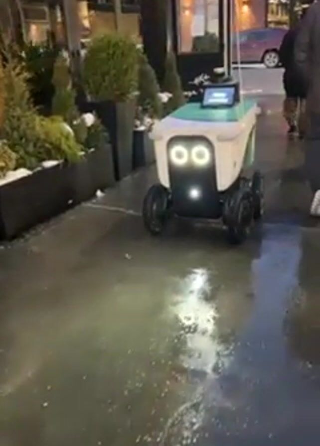 A small, autonomous delivery robot is shown on a sidewalk