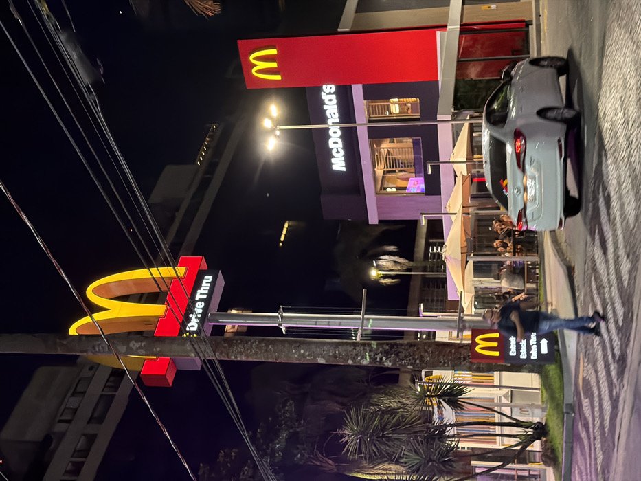 A McDonald's restaurant at night features a large sign with the golden arches and "Drive Thru." A white car is parked nearby. The restaurant building has outdoor seating with umbrellas. A man walks past a smaller McDonald's sign that reads "Entrada Estacionamento Drive Thru." Palm trees and other greenery are visible. Overhead power lines are present.