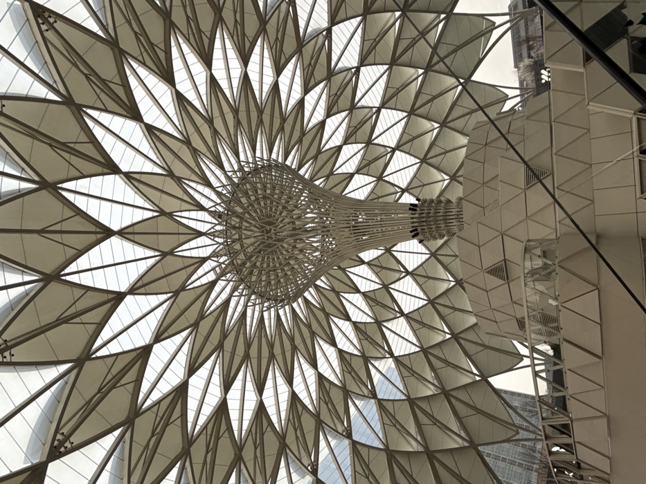 The image displays the interior architecture of a large, modern building, specifically identified as being in Changping District, China. The primary subject is a vast, domed or vaulted ceiling constructed from a complex, tessellated framework of light-colored structural beams. This framework forms a radial pattern, resembling a large stylized flower or leaf, and incorporates numerous alternating translucent panels, likely glass, and opaque, light-colored membrane or solid panels, allowing diffuse natural light to illuminate the space. Suspended centrally from this ceiling is a large, sculptural column, composed of numerous slender, vertical, light-colored rods arranged in an open lattice or basket-weave pattern. This column tapers downwards from a wider top to a narrower base, where it connects to a multi-tiered, angular architectural structure below. This lower structure is finished with light-colored, predominantly triangular panels, creating a faceted, terraced appearance. Sections of this lower structure feature both solid and transparent (glass) railings, suggesting accessible platforms or balconies. No individuals are present. Glimpses of modern buildings with glass facades are faintly visible in the background, external to the main structure, through translucent ceiling panels and openings, indicating an urban environment.