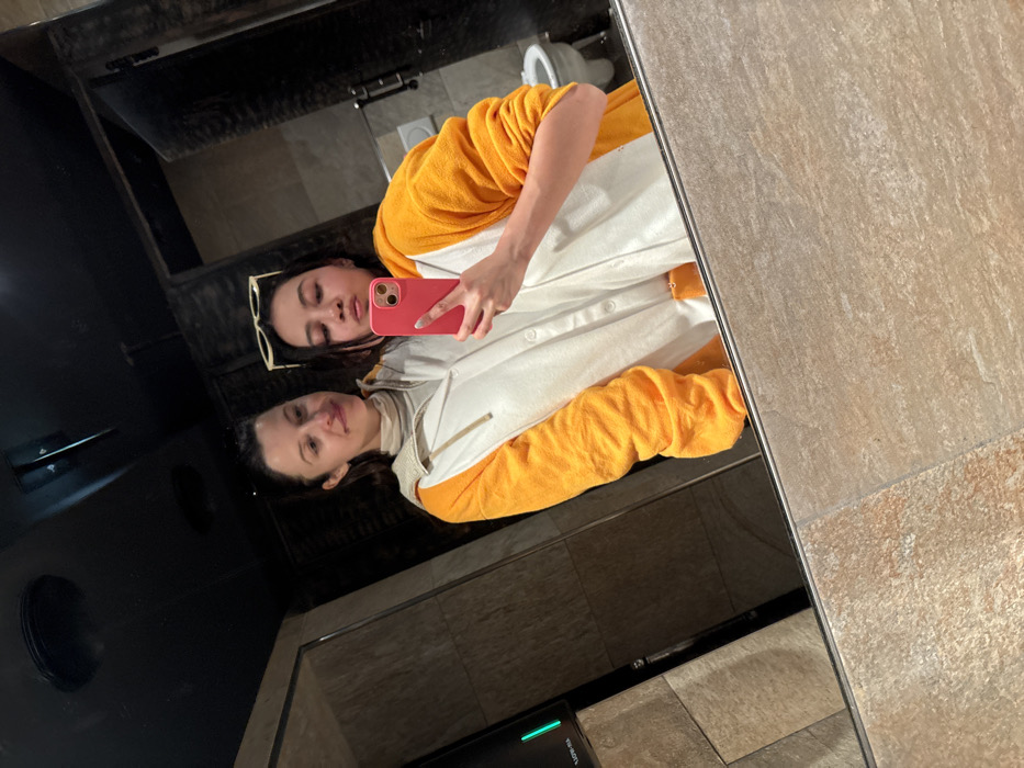 A mirror selfie captures a person in a white and yellow top, holding a pink phone